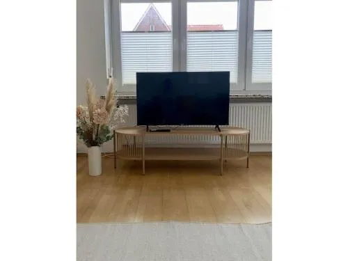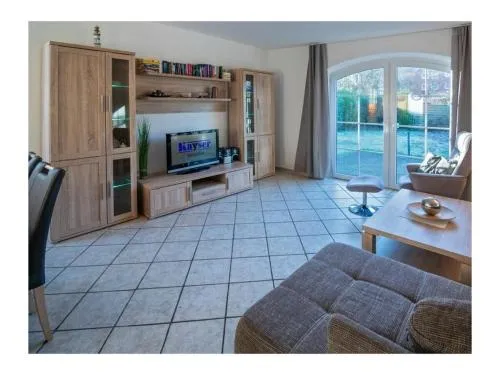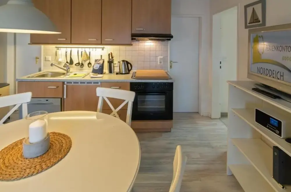 More information about Haus Schönborn Norden FamilyFerienwohnung Marie-Norddeich-Muschelweg in Norden offers a two-bedroom apartment with a living room, kitchenette, balcony, and TV, plus modern amenities such as free WiFi, tea and coffee maker, hairdryer, outdoor furniture, refrigerator, microwave, dishwasher, oven, stovetop, and toaster. Located a 7-minute walk from Norddeich Beach and 1.
