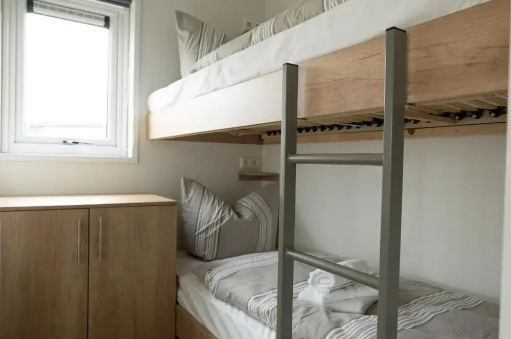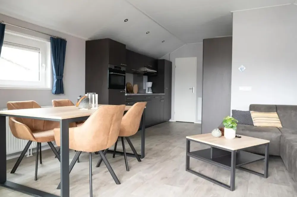 More information about Chalet bis 6 Personen ohne HundChalet bis 4 Personen ohne Hund in Norden offers a holiday home with two bedrooms, a terrace, restaurant, and free WiFi. A fully equipped kitchenette, kitchen, coffee machine, and outdoor furniture accompany modern amenities including a refrigerator, microwave, dishwasher, shower, TV, electric kettle, oven, stovetop, and toaster.