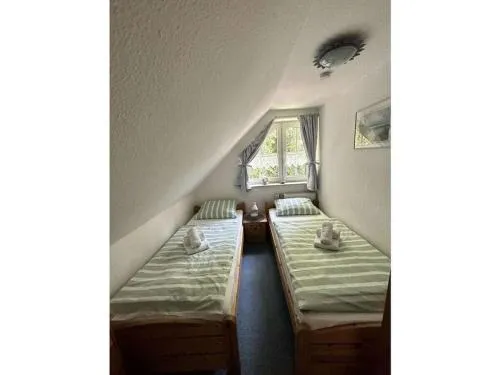 More information about Ferienwohnung KlabautermannChalet bis 5 Personen ohne Hund in Norden offers a holiday home with two bedrooms, a terrace, restaurant, and free WiFi, featuring a fully equipped kitchenette, coffee machine, outdoor furniture, refrigerator, dishwasher, TV, electric kettle, and toaster. Free on-site private parking is available. Located 1.
