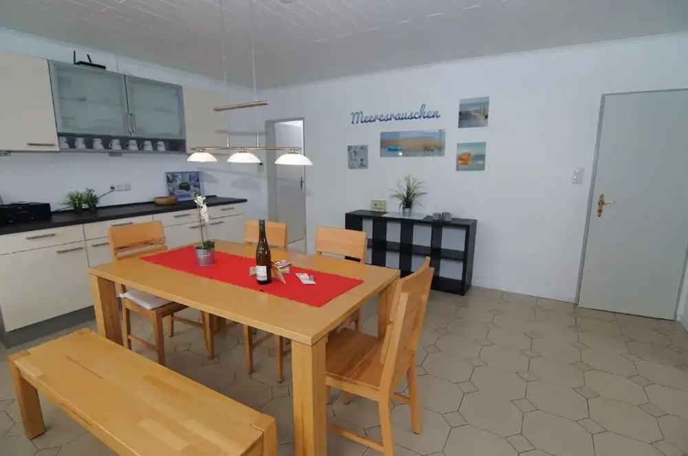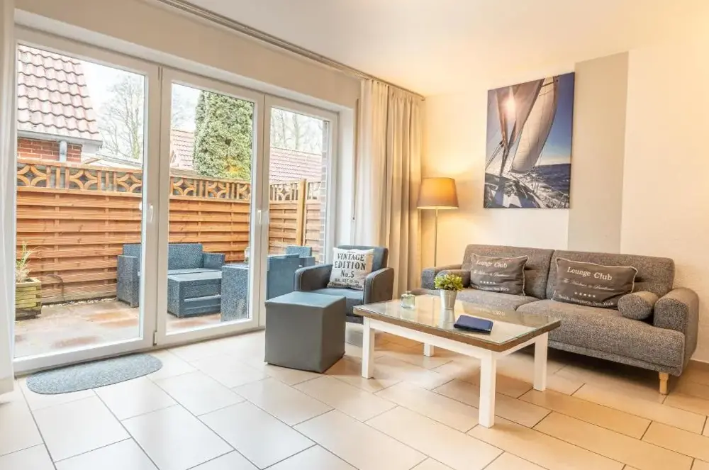 More information about Luxus 5 Sterne Ferienhaus PilsumFerienwohnung Krabbenstraße in Norden offers a three-bedroom apartment with a private entrance, parquet floors, a fully equipped kitchen, and a dining area. Modern amenities include free WiFi, a kitchenette, a TV, sofa, barbecue, and outdoor furniture.