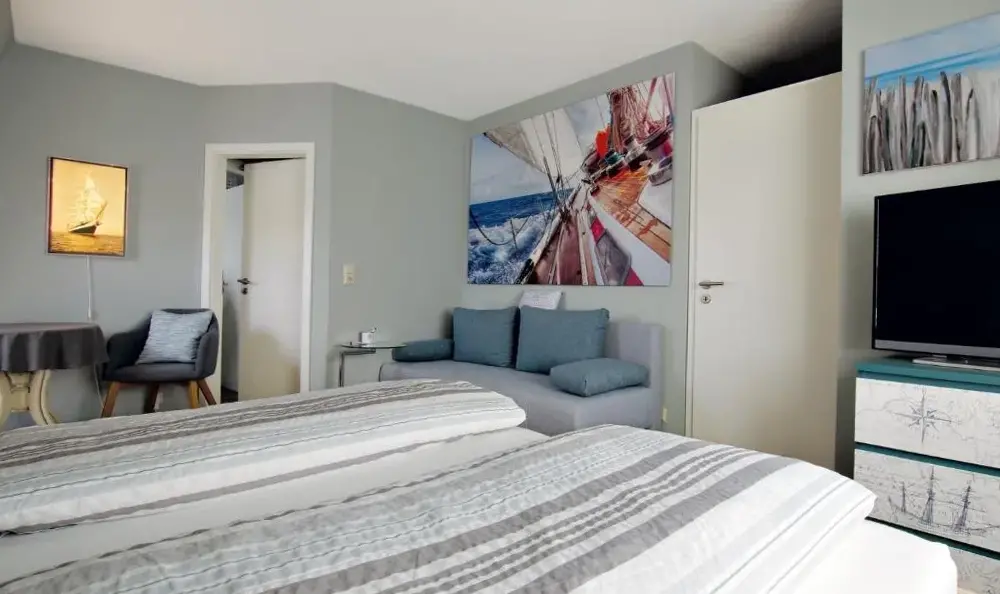 More information about Kleiner PiratHotel Julia am Deich in Norden offers comfortable accommodations with private bathrooms, tea and coffee makers, a refrigerator, and a work desk. Each room features a TV, parquet floors, a wardrobe, and access to essential facilities including free WiFi, a sun terrace, and free on-site private parking. Guests can enjoy a balcony or terrace with inner courtyard views.