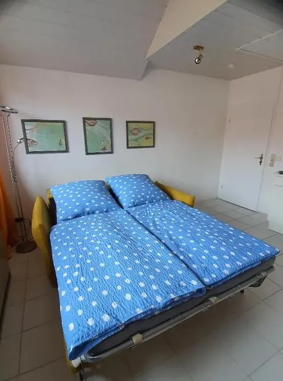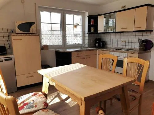 More information about Kleine AuszeitFerienwohnung Mond&Wasser 1 offers a spacious ground-floor apartment in Norden with a terrace and garden views, featuring a kitchenette, dining area, and private bathroom. Modern amenities include free WiFi, a coffee machine, TV, microwave, soundproofing, sofa bed, and a dining table with a refrigerator and electric kettle. Located just 15 minutes from Norddeich Beach and 0.