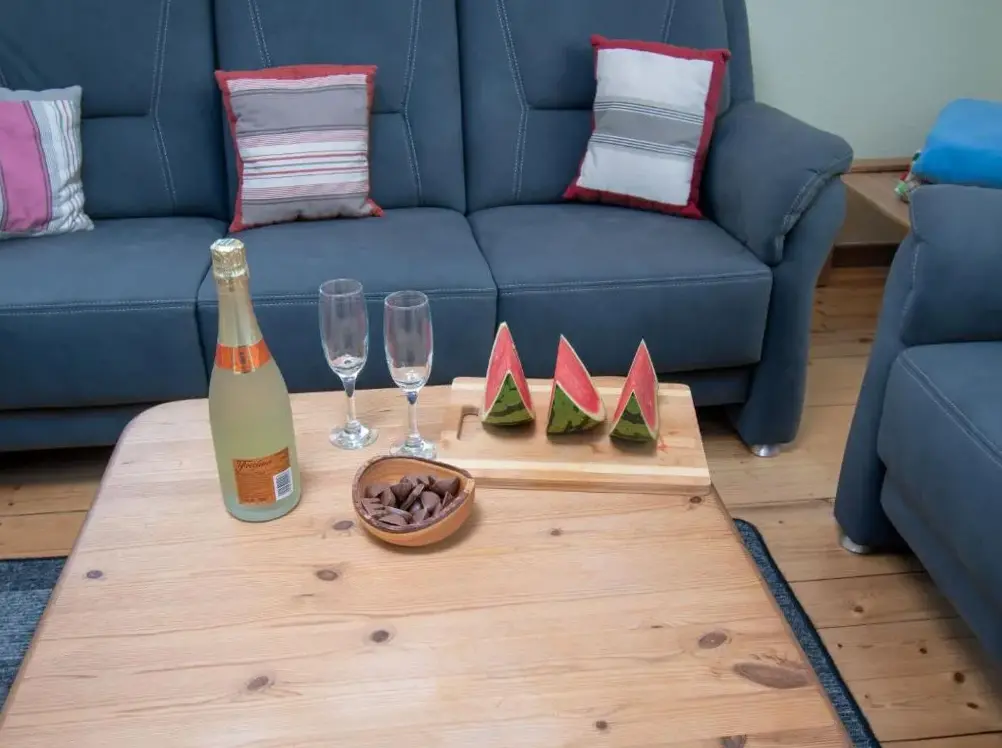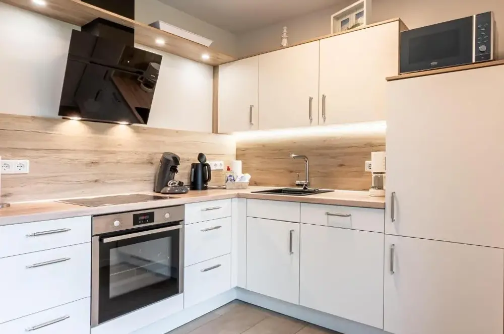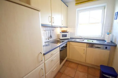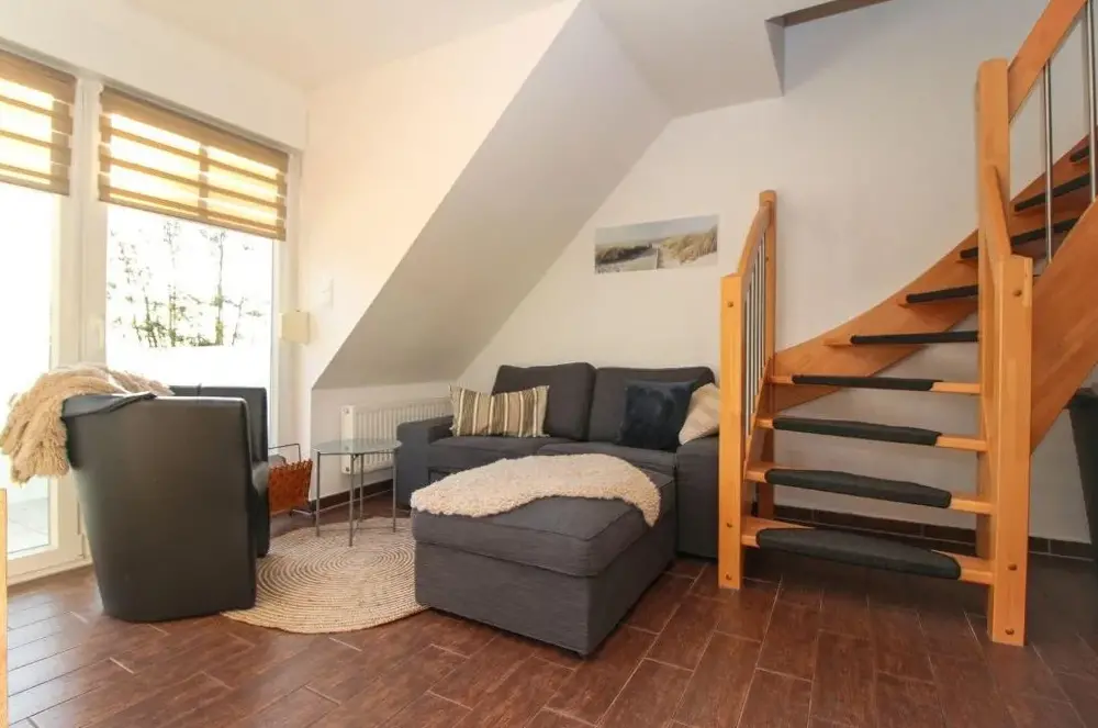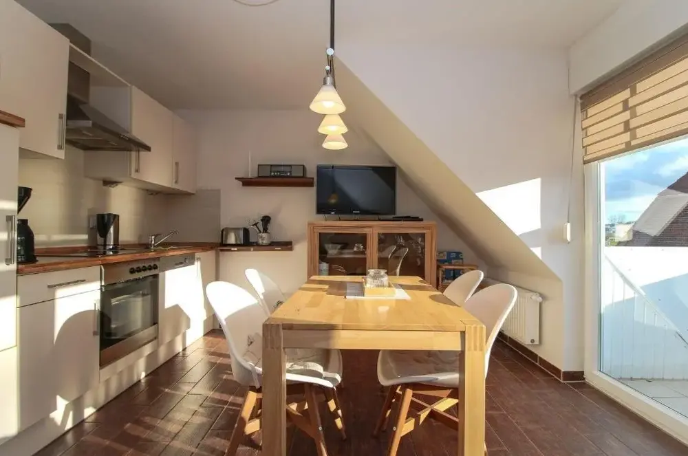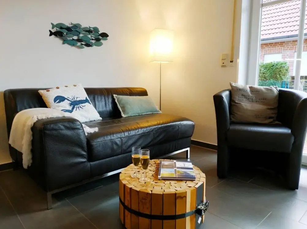 More information about Mienhus Apartments Ferienwohnung MommeChalet bis 4 Personen ohne Hund in Norden offers a cozy holiday home with one bedroom and a spacious living room, a terrace, and a restaurant, plus free WiFi. Guests can enjoy a fully equipped kitchenette with a coffee machine, refrigerator, microwave, dishwasher, oven, stovetop, toaster, and electric kettle.
