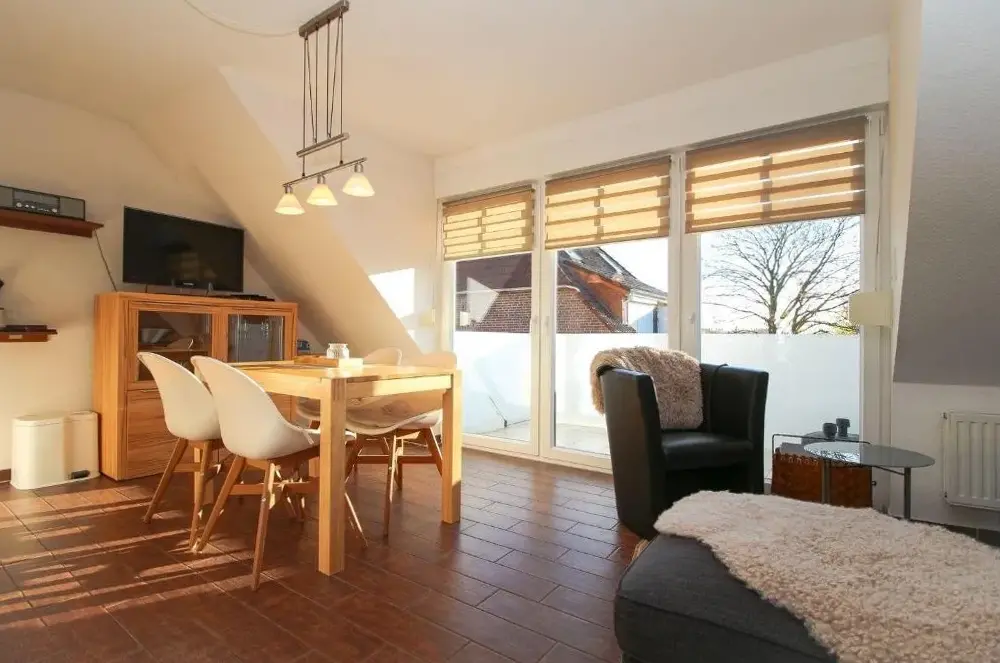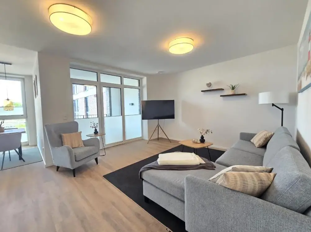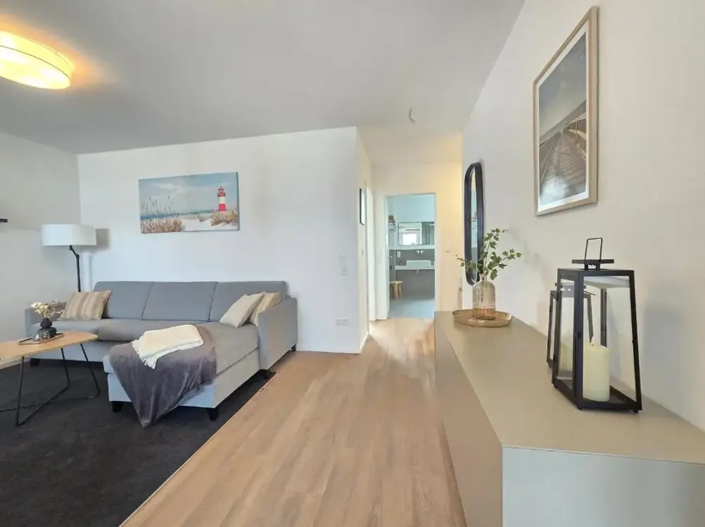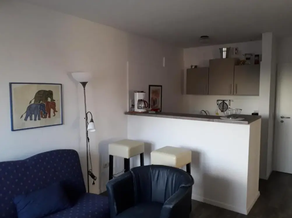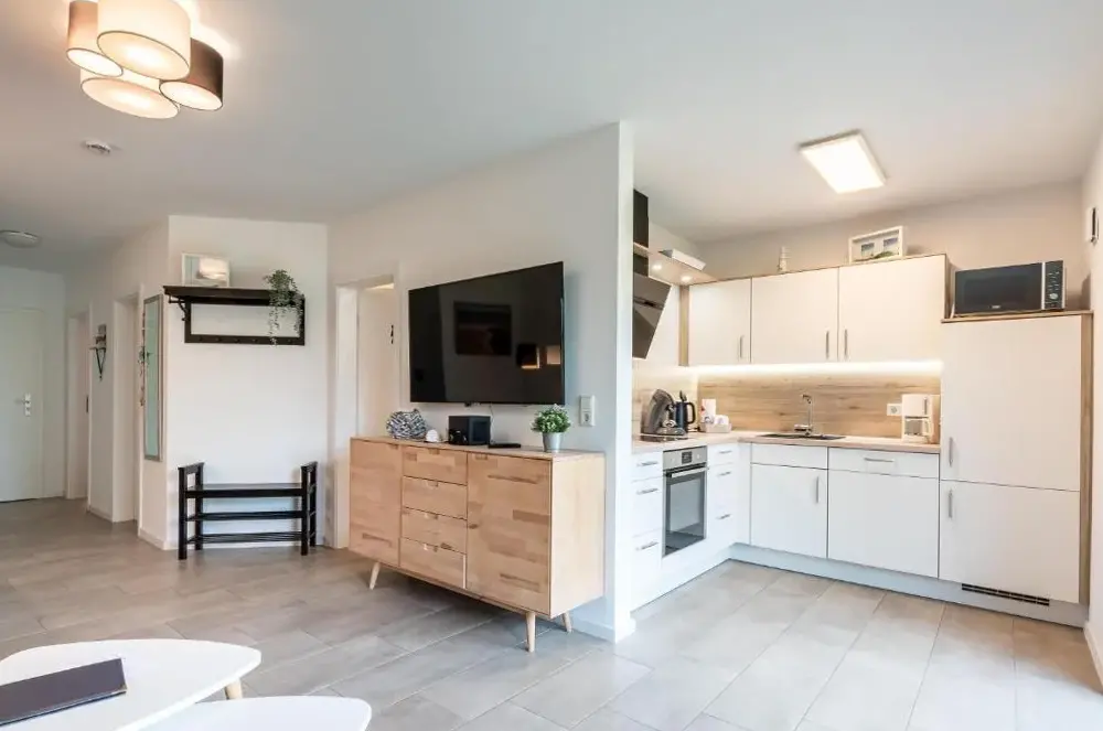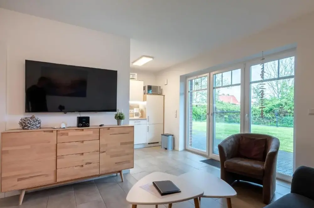More information about Ferienappartment Weisse DüneMienhus Apartments Ferienwohnung Momme in Norden offers a spacious living room with a sofa and dining table, a fully equipped kitchen with a coffee machine, microwave, and dishwasher, and access to a garden with outdoor seating. The property provides a children’s playground and free WiFi throughout.