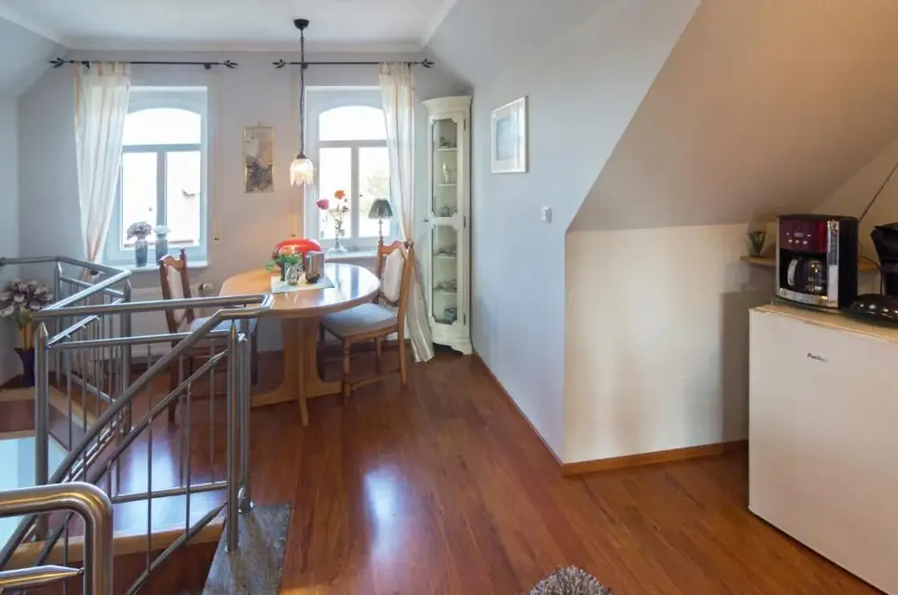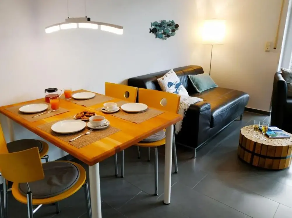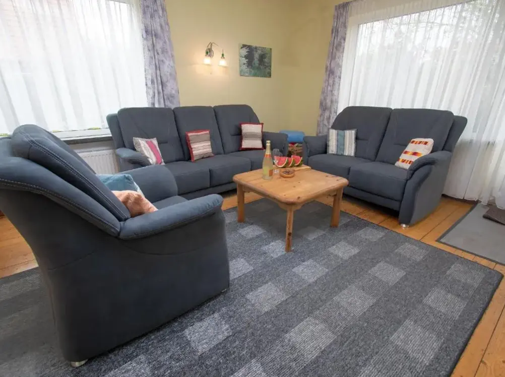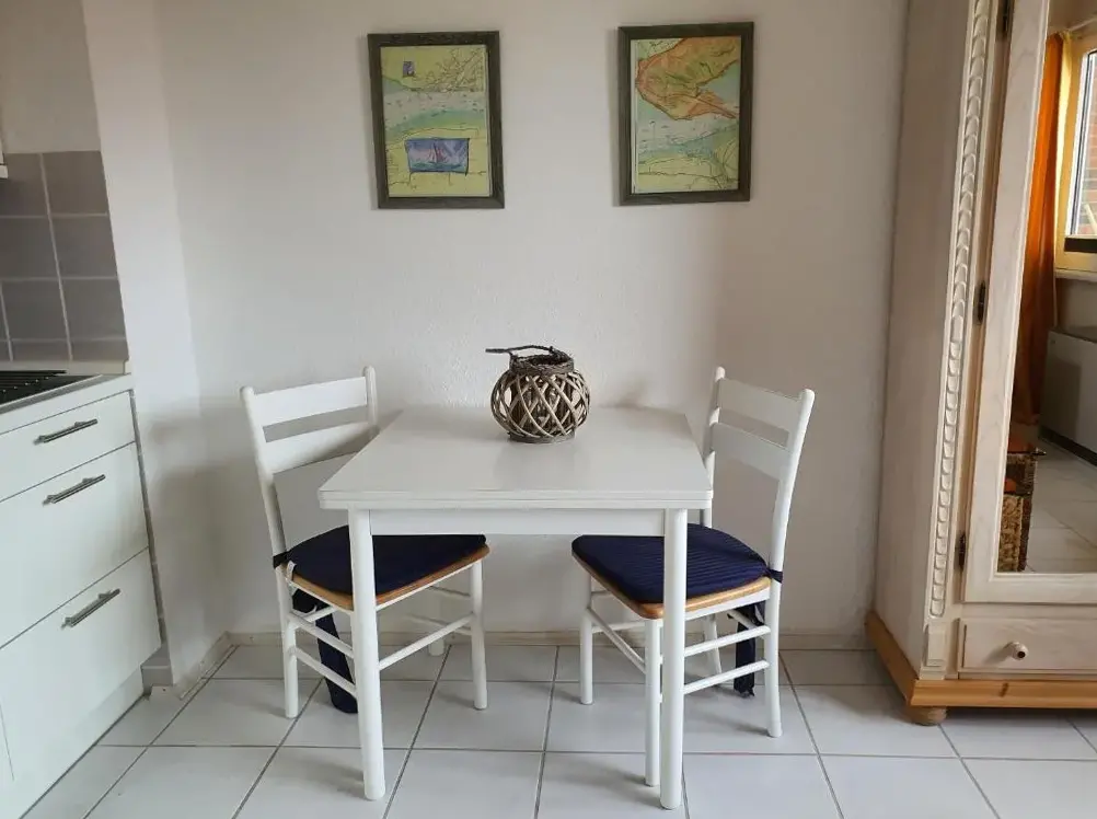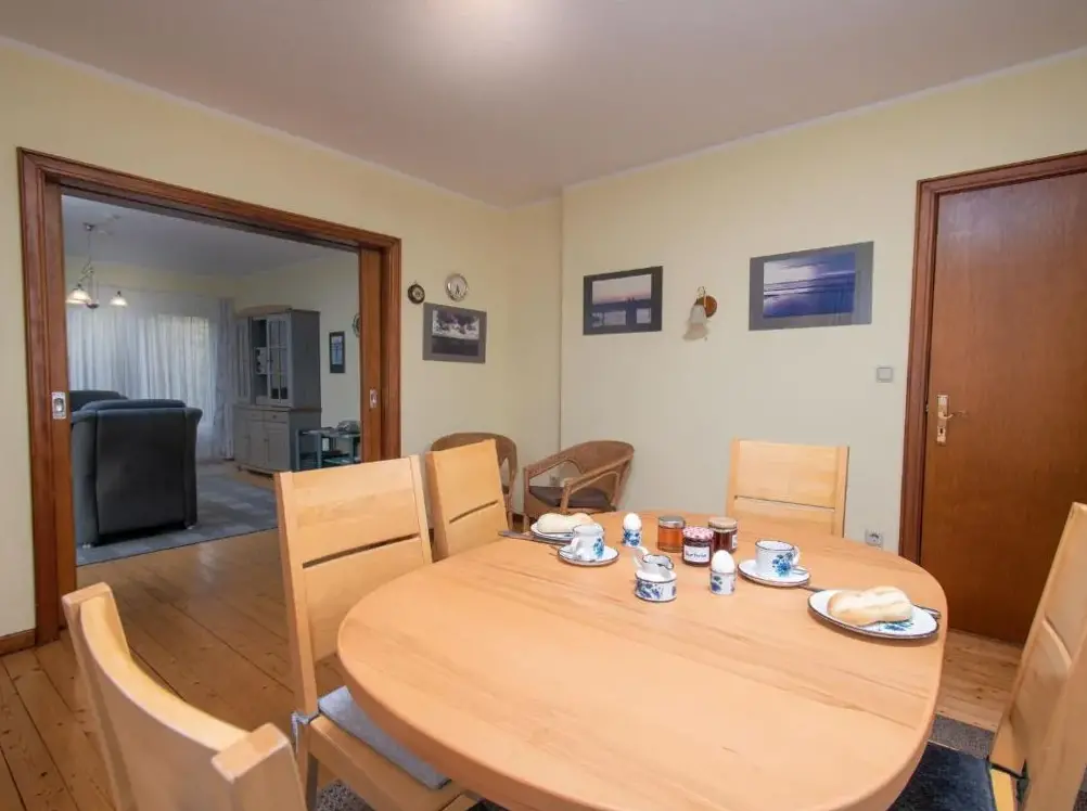 More information about Ferienappartment Weisse DüneMienhus Apartments Ferienwohnung Momme in Norden offers a spacious living room with a sofa and dining table, a fully equipped kitchen with a coffee machine, microwave, and dishwasher, and access to a garden with outdoor seating. The property provides a children’s playground and free WiFi throughout.