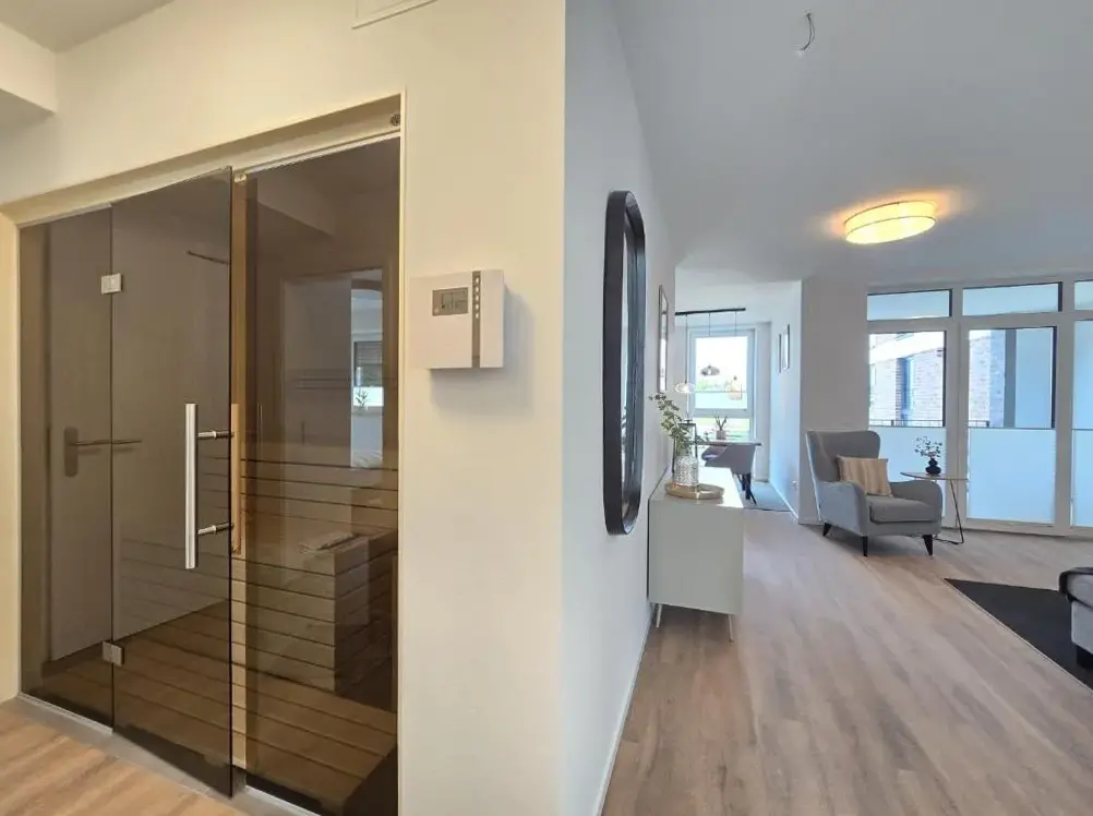 More information about Ferienwohnung Mond&Wasser 1Ferienappartment Weisse Düne in Norden offers a spacious apartment with two bedrooms and a balcony overlooking a landmark, a fully equipped kitchen, and a washing machine. Modern amenities include a sauna, free WiFi, elevator access, dining area, sofa, TV, and outdoor seating. Free on-site private parking is available.
