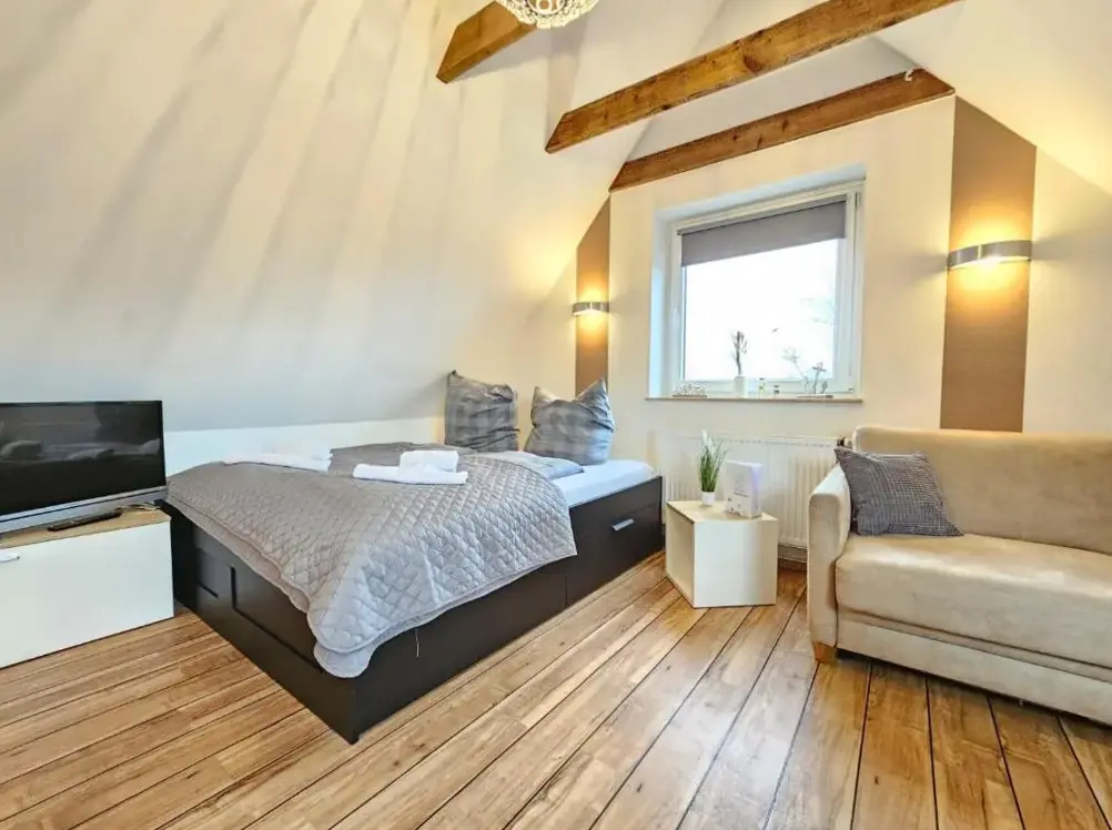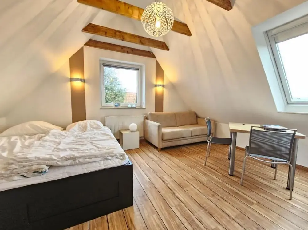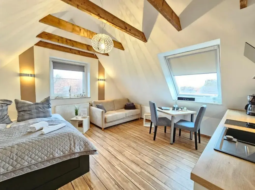 More information about Chalet bis 4 Personen ohne HundApartments Norddeicher Straße in Norden offers comfortable rooms with free WiFi and modern facilities including an elevator, family rooms, bicycle parking, and free on-site parking. The kitchenette, dining area, and a private bathroom add convenience, with an à la carte breakfast featuring juice and cheese.
